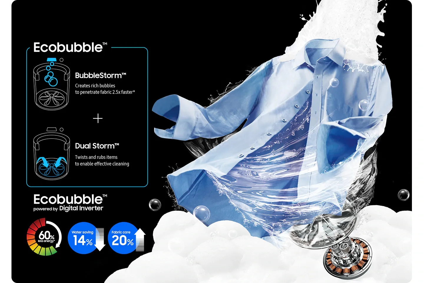 Cut your normal laundry time by up to 56%* and get clothes thoroughly clean. Super Speed washes a load in just 31 minutes*. It ensures powerful cleaning and reduces water usage by 38%**. In addition, it shortens the rinsing time by shooting powerful jets of water and accelerates the spin speed.